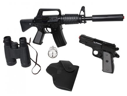 Tout l’attirail du parfait policier est contenu dans ce set des forces spéciales : une mitraillette avec silencieux, un pistolet avec étui, une paire de jumelles factice et un insigne de police. Les armes sont en métal et en plastique.