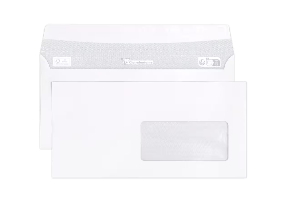 FORMAT : DL-110x220mm. Il peut contenir une feuille A4 (21×29,7 cm) pliée en 3. CARACTERISTIQUES : enveloppe avec fenêtre Papier Cristal dimension 45×100 (position 20/20). Son fond est imprimé en gris, pour assurer la confidentialité de vos courriers. FERMETURE : Auto-adhésive, la colle est protégée par une bande siliconée, elle garantit une fermeture efficace et durable.